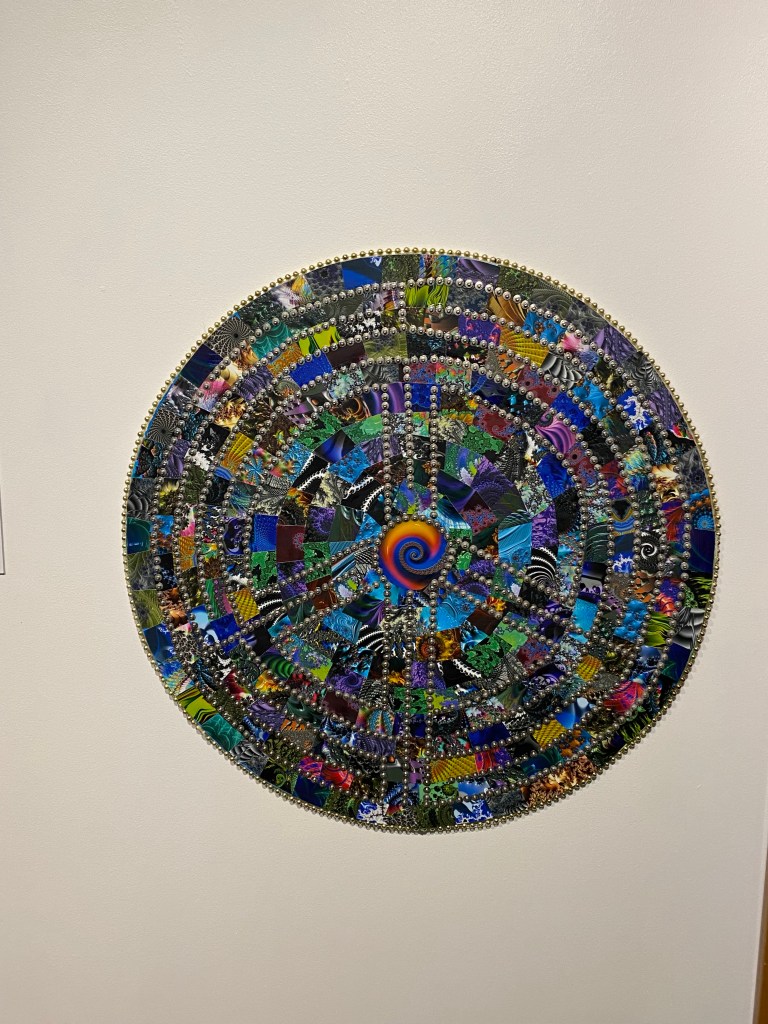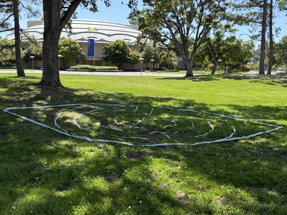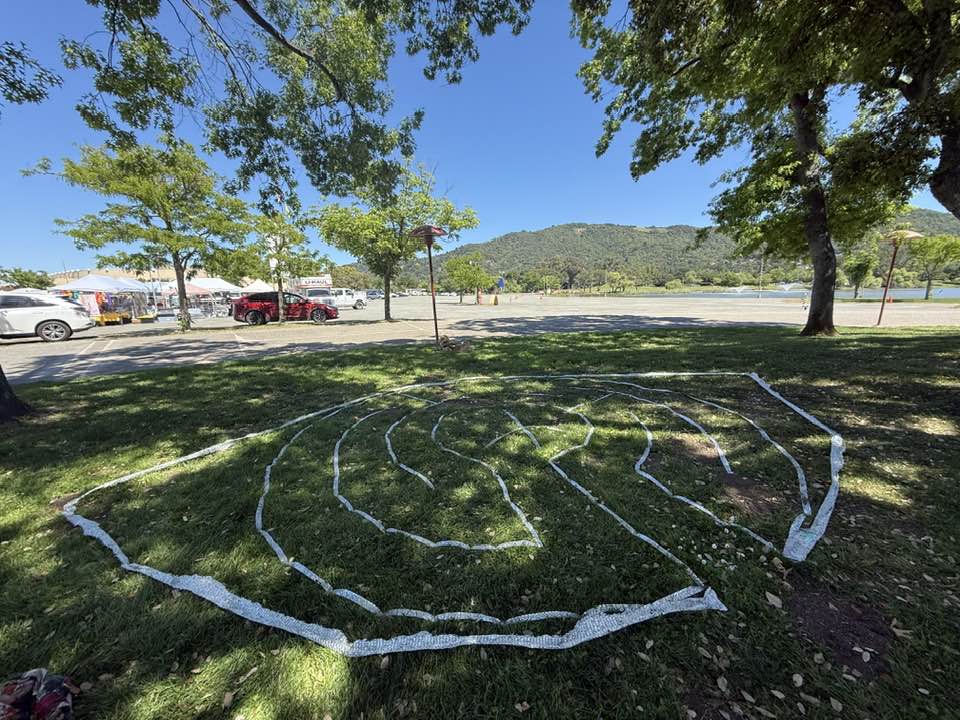 “Eye Am Peace” 3 circuit labyrinth eye constructed at the New Living Expo in San Rafael. Sequined ribbon lines the pattern with some sparkly silver ribbon forming the quadrants of a peace sign at the center. Strips cut from the silver scrim backing the original “One Peace Labyrinth” form the ellipse around the eye.
